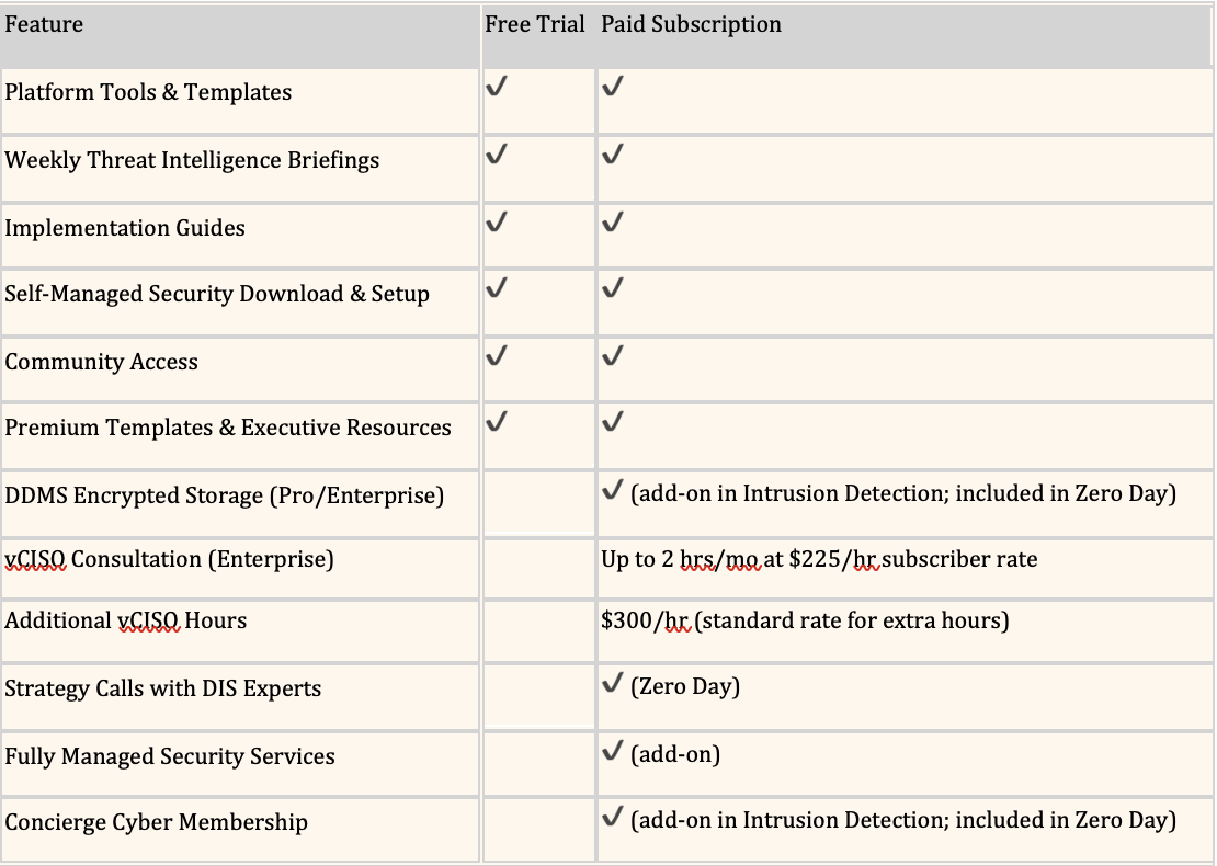 - vCISO Lite: up to 2 hours/month at DIS Intelligence Suite discounted rate ($225/hr; additional hours at $300/hr)
